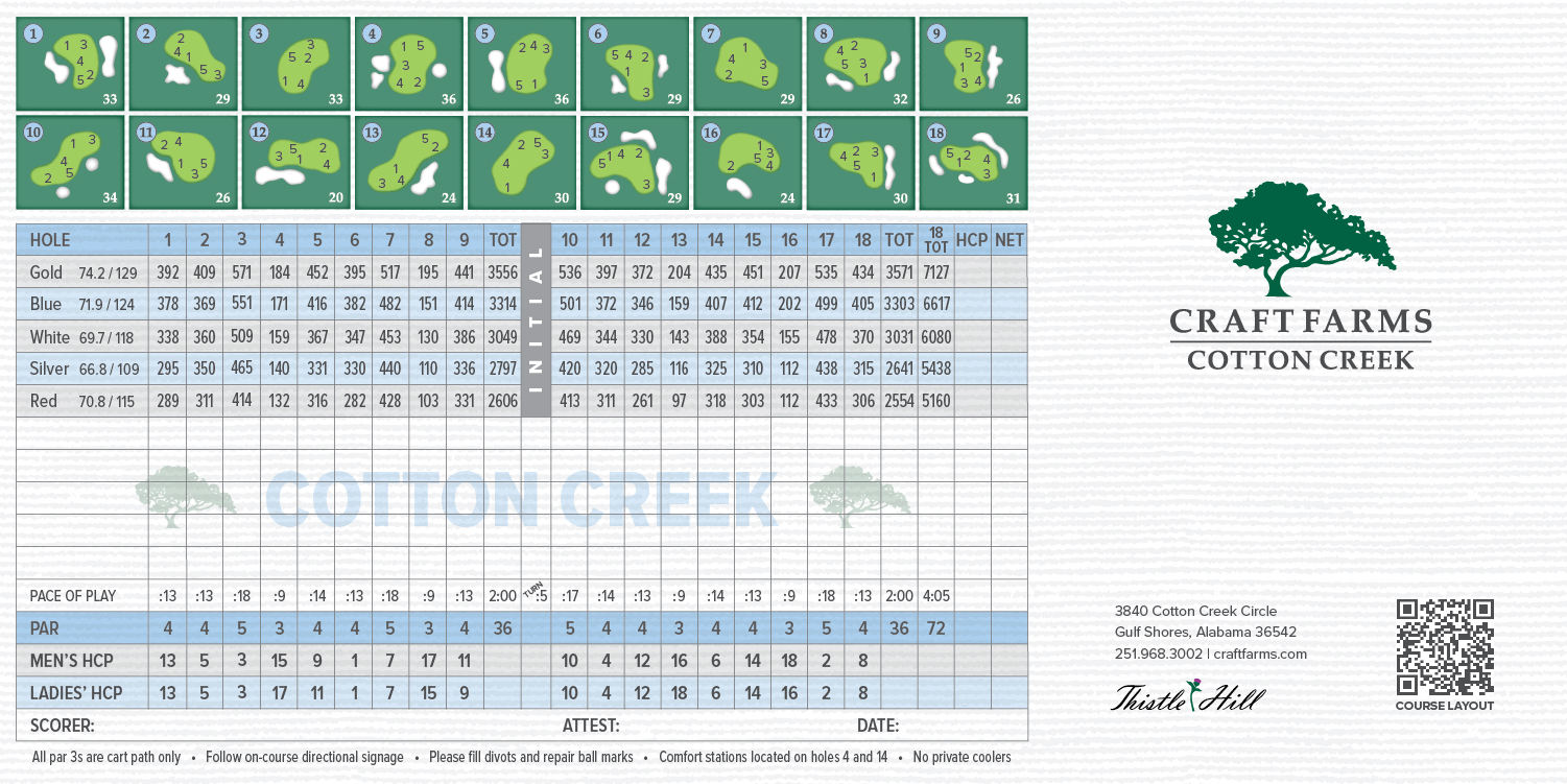 Featuring rolling fairways and large undulating greens, Cotton Creek at Craft Farms Golf Course is very playable from the forward tees and a true championship challenge of over 7,000 yards from the tips. True to its Palmer design, this traditional 18-hole masterpiece was laid out to challenge rather than intimidate, with numerous risk/reward opportunities throughout.