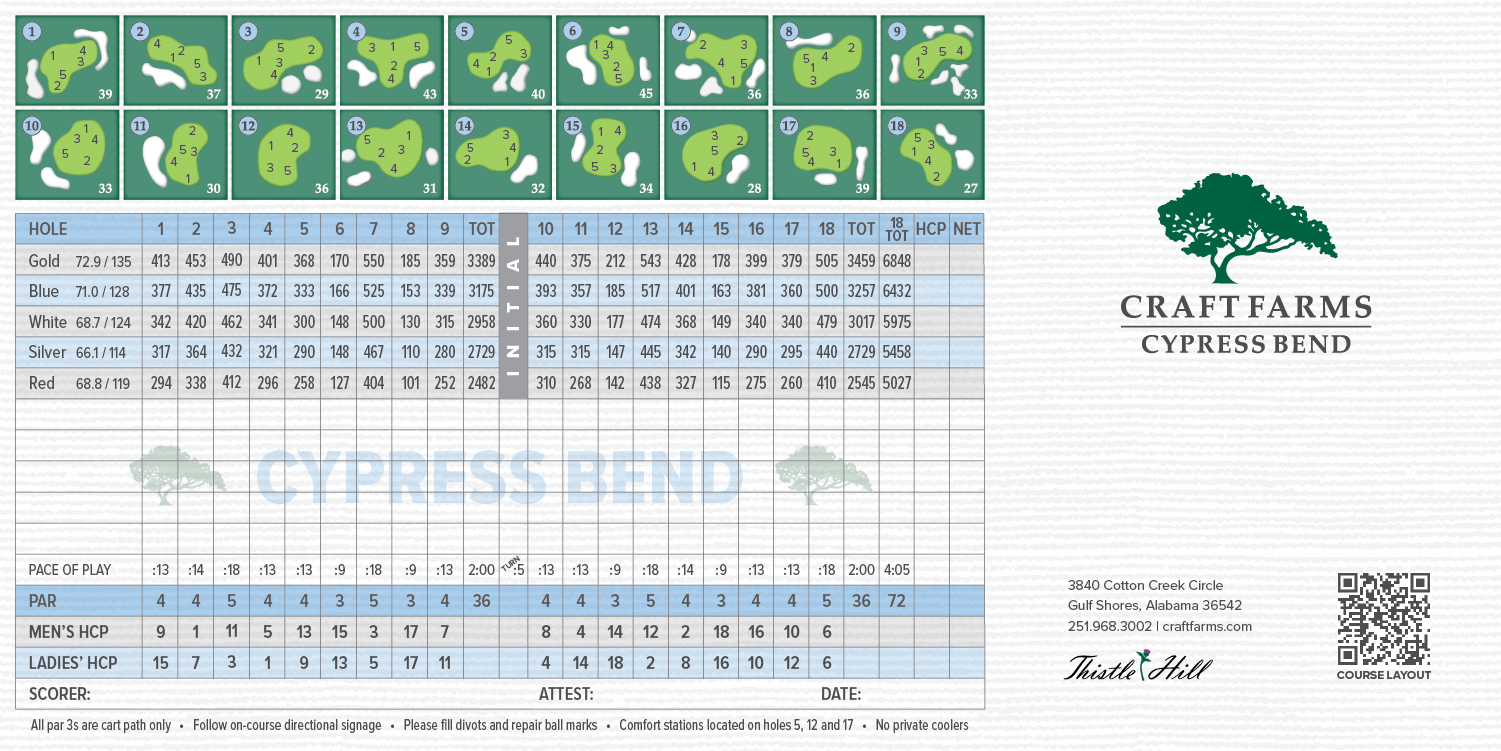 Cypress Bend at Craft Farms Golf Course boasts a 4-1/2 star rating by Golf Digest. This architectural masterpiece, features staggered tee boxes, sprawling bunkers, top quality putting surfaces and year–round lush conditions. A perfect complement to its big sister, Cotton Creek, this course has a coastal feel as it traverses a unique system of cord-grass accented lakes which come into play on nearly every hole. Cypress Bend offers wide fairways, vast landing areas and large undulating greens, giving golfers confidence as they prepare to tackle this Palmer creation.